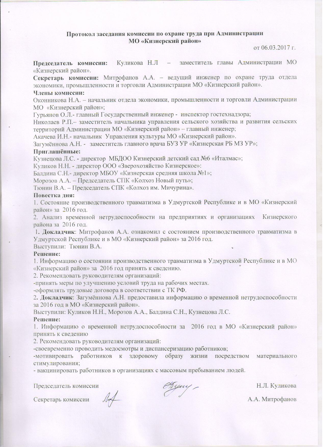 Протокол заседания комиссии по охране труда при Администрации МО "Кизнерский район" от 06.03.2017 г.