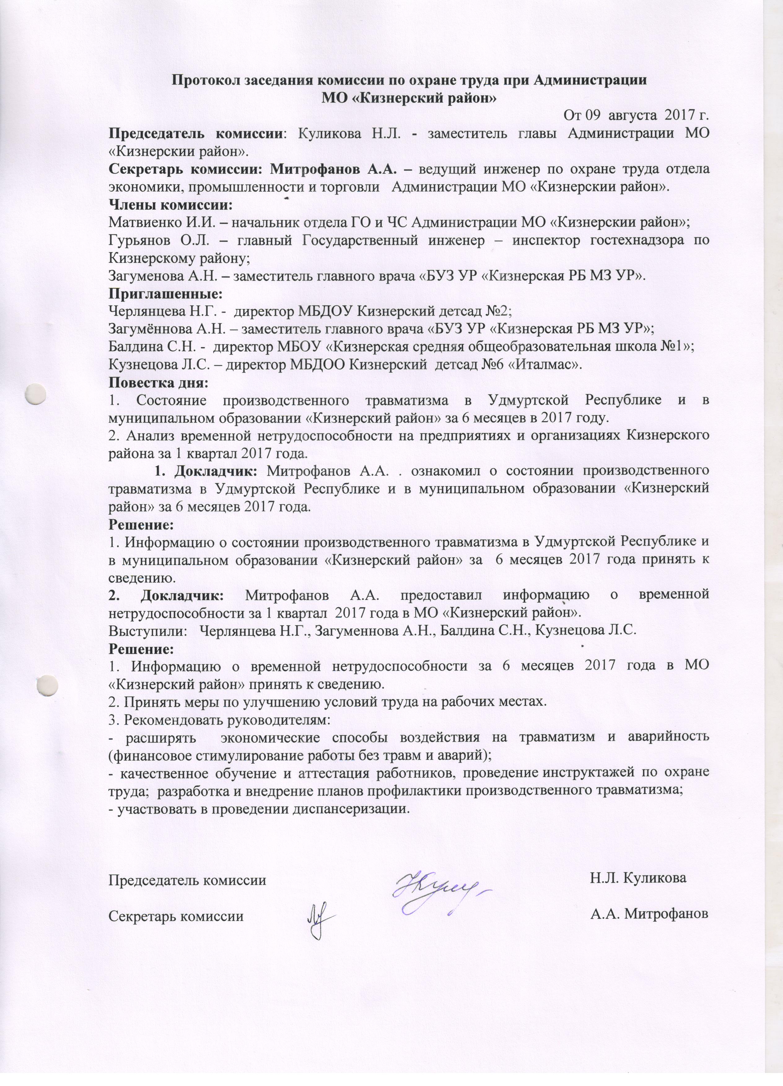 Протокол заседания комиссии по охране труда при Администрации МО "Кизнерский район" от 09.08.2017 г.