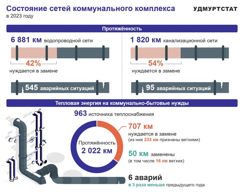 ИНЖЕНЕРНЫЕ КОММУНИКАЦИИ ТРЕБУЮТ ПЕРЕОСНАЩЕНИЯВ 2023 году на территории республики действовали 162 канализационных и 1315 водопроводных коммуникаций. Одиночное протяжение водопроводной сети составило 6881 км, канализационной – 1820 километров. Техническое состояние водопроводно-канализационных сооружений сложное – коммуникации требуют переоснащения. В Удмуртской Республике нуждается в замене практически половина водопроводов (42%) и более половины канализационных сетей (54%). За год осуществлена замена 56,7 км водопроводных сетей (0,8% их общей протяженности) и 9,3 км канализационных сетей (0,5% их общей протяженности).В течение 2023 года в водопроводную сеть подано почти 112 млн куб. м воды, однако до потребителей дошло чуть более 84 млн кубометров, то есть практически четверть поданного в сеть объема не использована по назначению. Через канализационную сеть за тот же период пропущено более 63 млн куб. м сточных вод. Износ коммуникаций неизбежно приводит к дополнительному расходу воды в связи с возникающими порывами. За год зарегистрировано 545 аварий в системе водоснабжения и 95 – в системе водоотведения. Тепловую энергию на коммунально-бытовые нужды в течение года отпускали 963 источника теплоснабжения Протяженность тепловых и паровых сетей, задействованных в процессе передачи тепла потребителям республики, составляет чуть более 2,0 тыс. километров. При этом более трети (707 км) передающих сетей нуждаются в замене, из них 233 км признаны ветхими. В течение года было заменено лишь 50 км тепловых и паровых сетей, в том числе 16 км ветхих. За год отпущено потребителям 8441 тыс. гигакалорий тепловой энергии, при этом её потери в сетях составили более 14% отпущенного объема. Высокая степень износа тепловых сетей является причиной возникновения аварийных ситуаций в системе теплоснабжения. В течение года работниками аварийных служб республики было устранено 6 аварий. |
