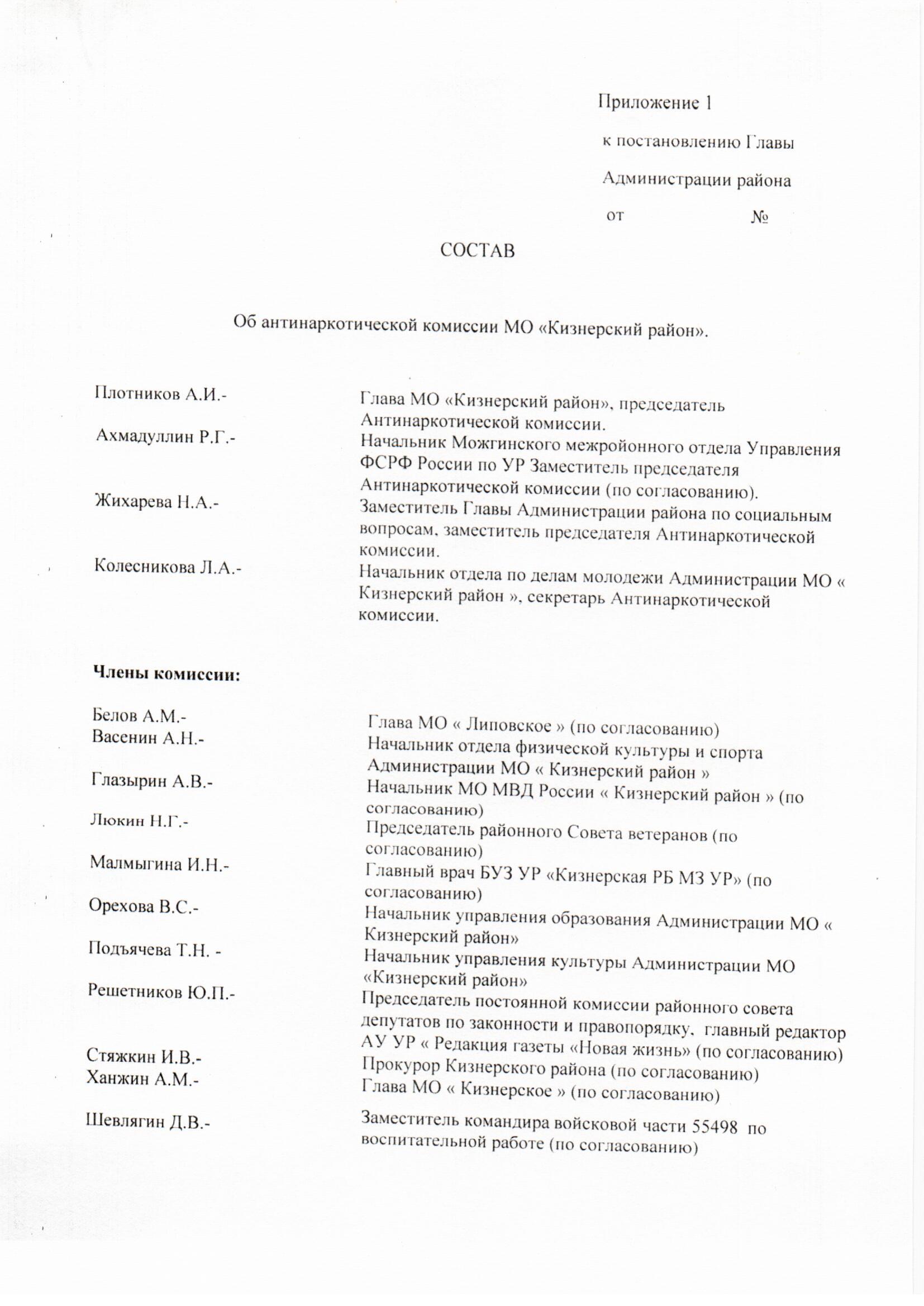 От 05.03.2014 года № 07 Пос.Кизнер Об утверждении состава антинаркотической комиссии в МО «Кизнерский район»
